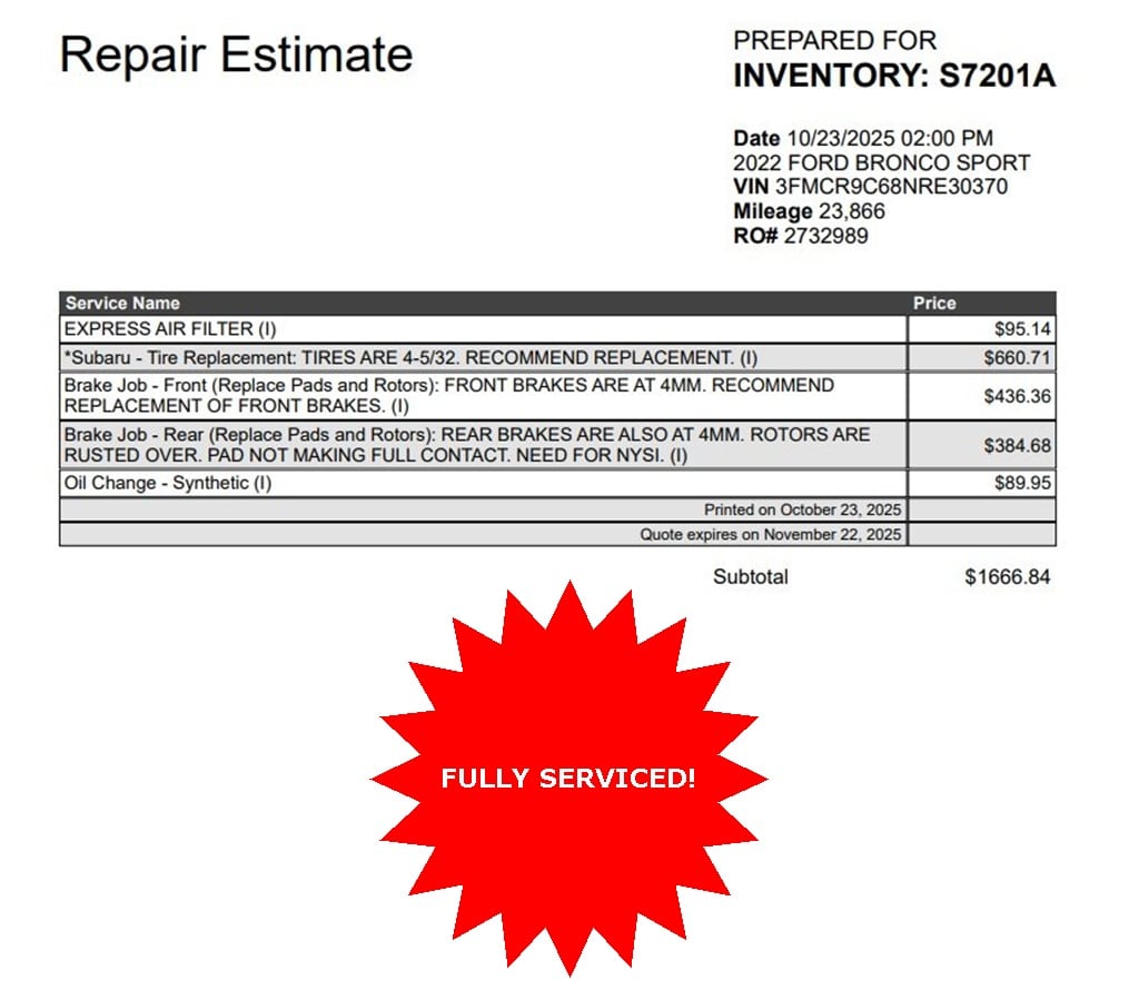 Royal Nissan Subaru is proud to offer this outstanding-looking 2022 Ford Bronco Sport a truly handsome SUV with the following Features: Class II Trailer Tow Package w/Trailer Sway Control, Equipment Group 300A, Tech Package (HD Radio, Universal Garage Door Opener (UGDO), and Wireless Charging Pad), 3.80 Axle Ratio, 4-Wheel Disc Brakes, 4G LTE Wi-Fi Hotspot Credit, 6 Speakers, ABS brakes, Air Conditioning, Alloy wheels, AM/FM radio: SiriusXM, AM/FM Stereo, Auto High-beam Headlights, Auto-dimming Rear-View mirror, Automatic temperature control, Brake assist, Cargo Management System, Compass, Delay-off headlights, Driver door bin, Driver vanity mirror, Dual front impact airbags, Dual front side impact airbags, Electronic Stability Control, Emergency communication system: SYNC 3 911 Assist, Four wheel independent suspension, Front anti-roll bar, Front Bucket Seats, Front Center Armrest, Front dual zone A/C, Front fog lights, Front reading lights, Fully automatic headlights, Heated door mirrors, Heated front seats, Heated steering wheel, Illuminated entry, Knee airbag, Leather Trimmed Heated Sport Contour Bucket Seats, Low tire pressure warning, Occupant sensing airbag, Outside temperature display, Overhead airbag, Overhead console, Panic alarm, Passenger door bin, Passenger vanity mirror, Power door mirrors, Power driver seat, Power passenger seat, Power steering, Power windows, Radio data system, Rain sensing wipers, Rear anti-roll bar, Rear Parking Sensors, Rear reading lights, Rear seat center armrest, Rear window defroster, Rear window wiper, Remote keyless entry, Roof rack: rails only, Security system, SiriusXM Radio, Speed control, Speed-sensing steering, Speed-Sensitive Wipers, Split folding rear seat, Steering wheel mounted audio controls, SYNC 3 Communications & Entertainment System, SYNC 3/Apple CarPlay/Android Auto, Tachometer, Telescoping steering wheel, Tilt steering wheel, Traction control, Trip computer, Variably intermittent wipers, and Wheels: 18" Ebony Black-Painted Aluminum.